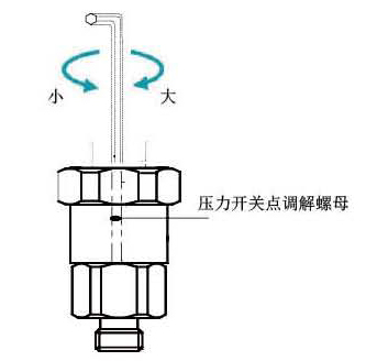第二步:參照上圖螺絲刀調(diào)解壓力開(kāi)關(guān)點(diǎn)大小,順時(shí)針?lè)较蛘{(diào)大,逆時(shí)針?lè)较蛘{(diào)小。
